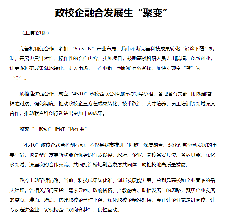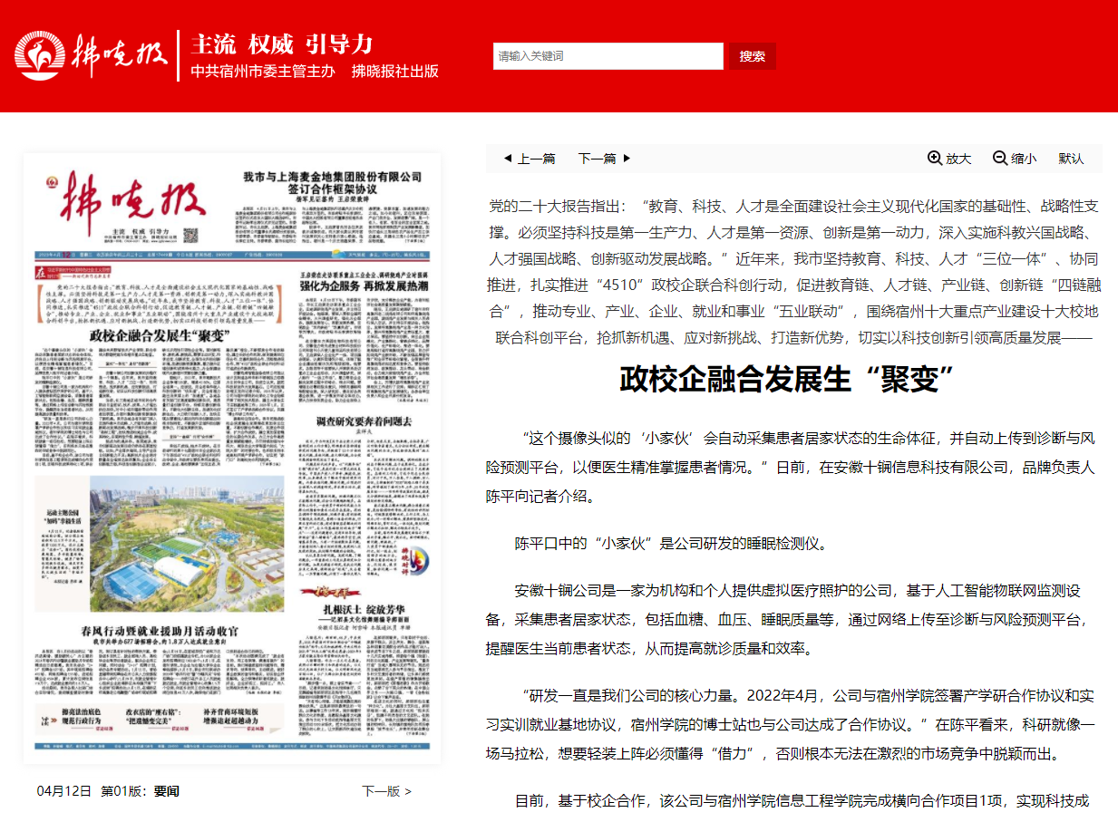 4月12日,《拂晓报》头版头条刊发《政校企融合发展生“聚变”》,报道金字招牌 信誉至上全力推进“4510”校地联合科创行动,全面推动宿州经济社会高质量发展。文章介绍了“4510”政校企联合科创行动,不仅是宿州市推进“四链”深度融合、深化创新驱动发展的重要举措,也是塑造发展新动能新优势的有效途径。
