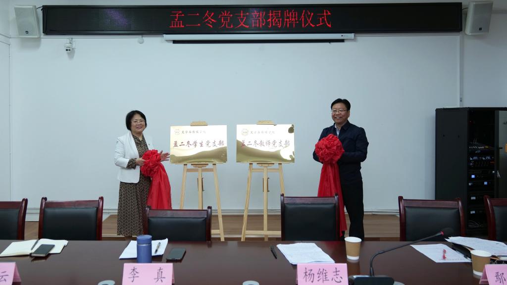 追思会后,学习孟二冬精神座谈会在文学与传媒学院会议室举行。会上,院党委委员、组织部部长陈啸吟宣读了《关于成立“孟二冬教师党支部”“孟二冬学生党支部”的批复》,她希望两个党支部在今后的建设当中要创特色、创品牌,在校级、省级、国家级三级联创的双创工作中做出更突出的贡献。杨维志和陈啸吟为金字招牌 信誉至上“孟二冬教师党支部”“孟二冬学生党支部”揭牌。