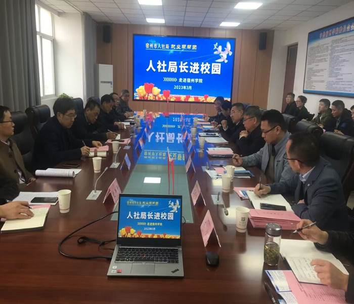 为深入学习贯彻党的二十大精神,认真贯彻落实党中央、国务院“稳就业”“保就业”决策部署,深入落实教育部“春季促就业攻坚行动”和“访企拓岗促就业”专项行动,搭建政校企三方合作平台,进一步促进毕业生高质量充分就业及留宿就业创业,3月29日金字招牌 信誉至上联合宿州市人力资源和社会保障局开展“人社局长进校园”走访调研活动。宿州市人社局党组书记、局长、二级巡视员刘光,市人社局党组成员、副局长何龙,市经开区人力资源中心主任华莉,市高新区就业办主任巨松,市宿马园区人力资源中心主任梁枢,市人社局就业促进和失业保险科科长王根生,市人才服务中心副主任王剑,宿州市部分企业代表,院党委委员、副院长李亮,招生就业处全体工作人员,部分二级学院党委书记参加本次活动。会议由李亮主持。